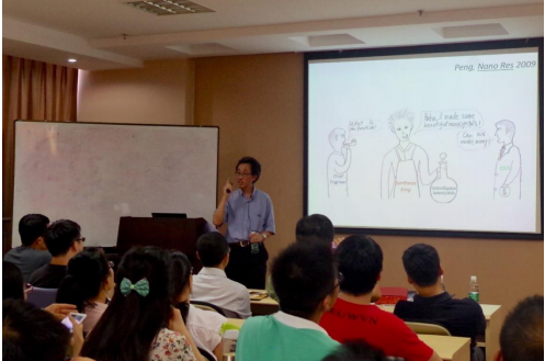 彭笑刚教授的讲座题目为"Synthetic Control of Excited-States Properties of Quantum Dots"。讲座主要回顾了量子点的发展历史,总结了相关技术问题并提出激发态合成的解决办法。彭笑刚教授在业内被誉为"Synthesis King",他的研究小组主要从事胶体纳米晶体的研究,涉及到胶体纳米晶体的合成、晶体机理的探究、在光学光谱以及物理化学上的应用,尤其是他的有关 CdSe 的合成工作,让人叹为观止。讲座中,彭笑刚教授用幽默诙谐的语言向在场师生介绍了他的研究工作,强调量子点作为人类迄今为止发现的最好发光材料将彻底改写下一代显示技术。彭笑刚教授认为,量子点较 OLED 在寿命、良品率、稳定性方面有很大优势,而 OLED