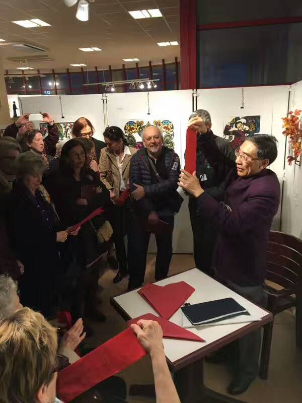陈竟教授向莉比茨亚市和东方博物馆赠送了马路、张雪峰、伍永娟的剪纸作品,并进行现场剪纸表演,传授剪纸技艺,赢得观众的热烈掌声及喝彩。一些观众动手学习剪出简单作品,表示非常高兴。陈竟教授将剪纸作品及庆阳香包赠送给观众,现场气氛十分友好。观众们对展出的中国民间剪纸、农民画、年画给予了很高评价,纷纷竖起大拇指称赞。(文化与自然遗产研究所)