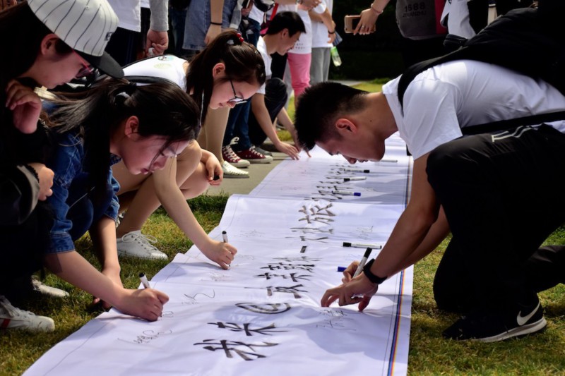 选手与志愿者在横幅上签名(摄影 毛玮)