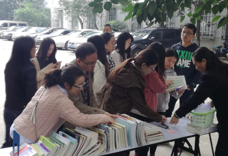 上午10点,如期盼中一样,天气转晴,活动也正式开始了。早就看到消息慕名而来的同学围在书桌旁,工程、计算类、公考类书籍前大家已迫不及待地挑选起了书。按照流程,每位同学只需挑好书后登记自己的姓名、学号等基本信息,就可以领走心仪的书。