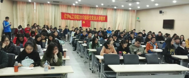 2017年11月22日下午,我校化学化工学院党委在仙林校区化学楼蒋雯若报告厅开展2017级新生党员入学教育,化学化工学院党委书记贾叙东作“学习十九大,建设双一流”的主题党课,会议由学院党委秘书李成英主持。