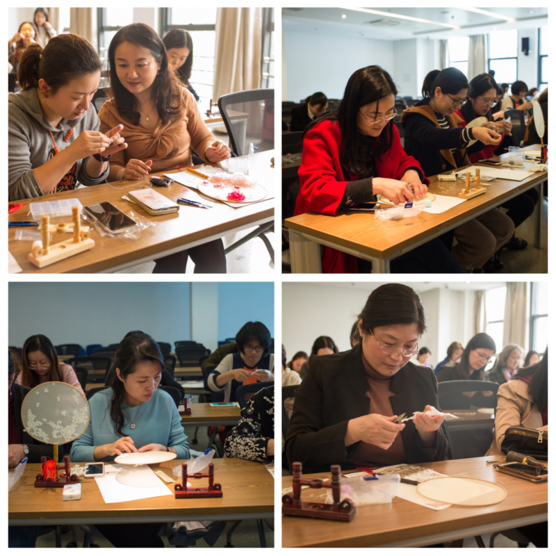 资深珠绣设计师王静文为大家介绍了团扇的悠久历史以及珍珠团扇的特点与制作技巧,并亲自示范起针、钉珠等手法。在辅导老师的指导下,大家穿针引线,钉珠绣花,并搭配珍珠、蕾丝、花片、水晶珠等辅材兴致盎然地在团扇上创意。平日奋战在教学、管理和服务一线的女教职工们享受着午后的悠闲时光,仔细琢磨着团扇的设计布局,时不时和身边的同事交流制作经验,大家有说有笑,整个房间洋溢着温馨愉悦的氛围。一个半小时之后,团扇制作活动接近尾声,女教职工们满怀欣喜地展示自己的作品,对于因时间关系尚未完全完成的作品,大家意犹未尽,纷纷表示回家后要继续加工,精心雕琢自己的作品。