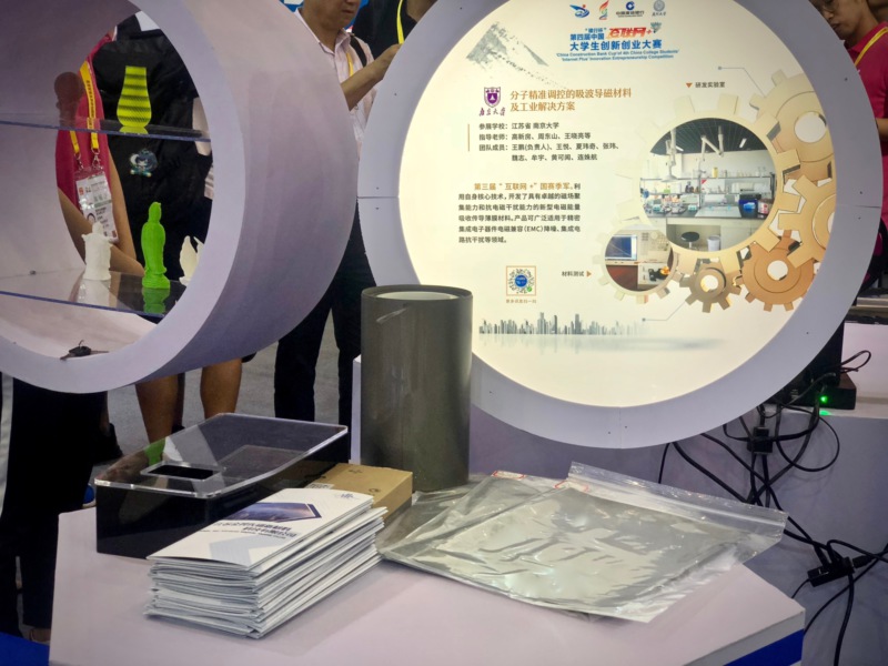 凯发k8官网先磁团队受邀参加本次优秀成果展览,并在工业制造展区获得专项成果展位。先磁团队由凯发k8官网化学化工学院2014届硕士毕业生王鹏及多名在校学生组成,其“分子精准调控的吸波导磁材料及工业解决方案”项目曾代表凯发k8官网荣获第三届全国大学生“互联网+”创新创业大赛金奖并最终斩获大赛季军。本次洽谈会上,凯发k8官网先磁团队展出了新一代超薄高磁导率吸波导磁材料以及4G、5G信号近场转化通讯的应用模型。