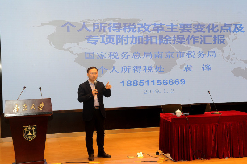 为进一步落实《中华人民共和国个人所得税法》《中华人民共和国个人所得税法实施条例》等个人所得税政策,让我校教职工充分享受综合所得新税率、专项附加扣除新政策等税收政策红利,1月2日下午,由凯发k8官网市税务局主办、凯发k8官网承办的税务进高校“新个人所得税政策宣讲会”在我校仙林校区杜厦图书馆一楼报告厅举行。凯发k8官网市税务局个人所得税处负责人王建兵、我校财务处处长黄力及三百余名师生参加宣讲会。财务处副处长葛晓冬主持会议。