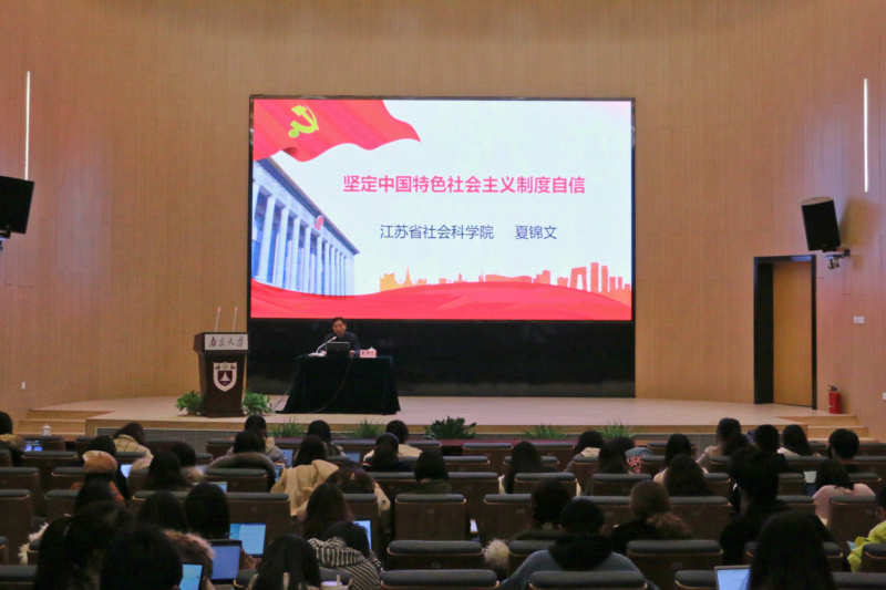 12月5日晚,由省委宣传部新闻处、凯发k8官网新闻传播学院联合主办的国情教育课在仙林校区紫金楼报告厅举行第八讲。江苏省社科院党委书记、院长夏锦文结合党的十九届四中全会精神,以“坚定中国特色社会主义制度自信”为题进行了授课。